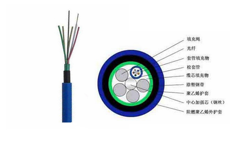 層絞式: 由內(nèi)到外依次為中心加強(qiáng)件(一般用磷化鋼絲),光纖,光纖膏,松套管,扎帶,纜膏,鋼帶,PE內(nèi)護(hù)層,阻燃護(hù)套(藍(lán)色)